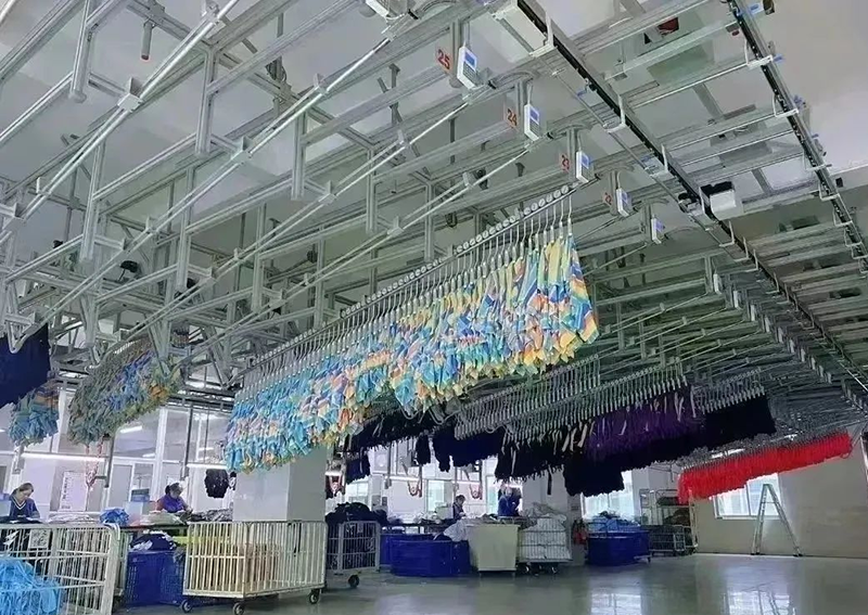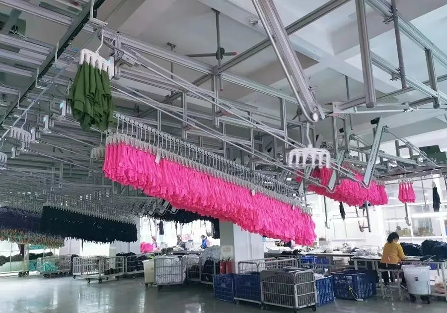 衣架可以在多條流水之間流轉(zhuǎn),在各工序工位之間按工藝流程自動(dòng)循環(huán)傳遞,實(shí)現(xiàn)集中掛片,集中縫制,集中后整,集中包裝,可長(zhǎng)時(shí)間地高速運(yùn)作,縮短生產(chǎn)周期、提升生產(chǎn)效率。