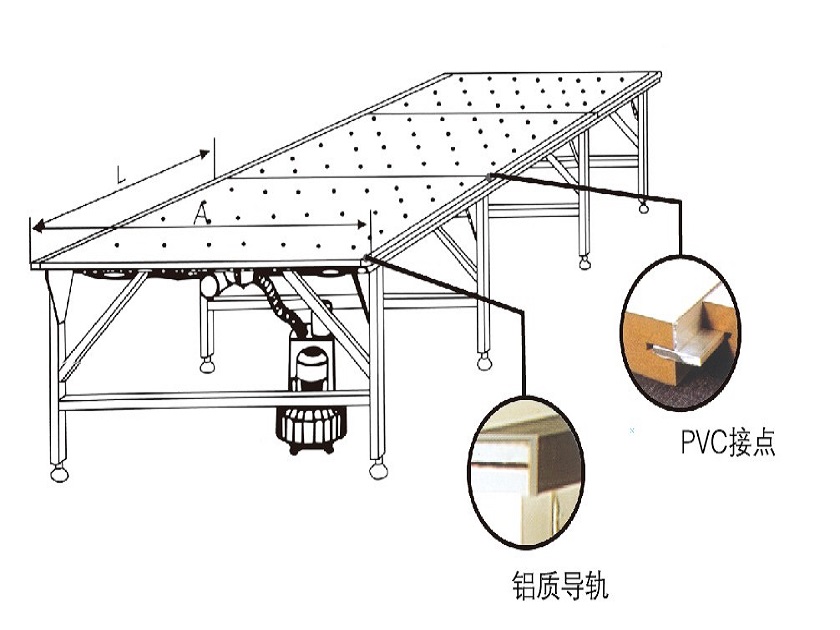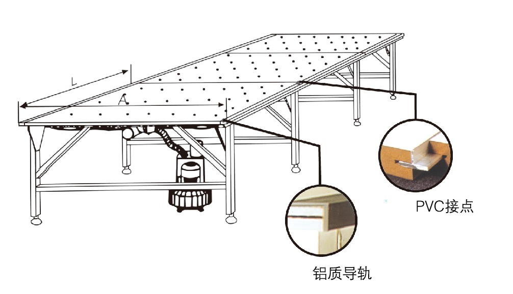 氣浮式臺板,可以確保面料在臺面上滑動時不被破壞。真空式臺板適應于大幅的排料圖,并在裁剪過程式中固定面料。臺面可做成薄片狀或涂漆的密度板。