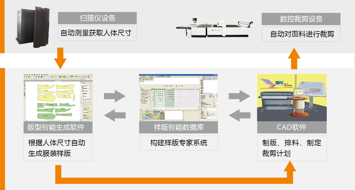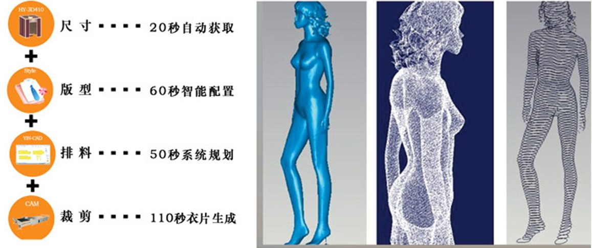 世界首創的集成裝備系統,以三維人體掃描技術為依托,以樣板自動生成設計軟件為核心,配以YINCAD軟件系統及和鷹高精度裁剪設備,全面提供從服裝量身定制到成衣尺寸智能獲取,裁剪樣片自動生成的一體化解決方案,實現服裝個性化生產。